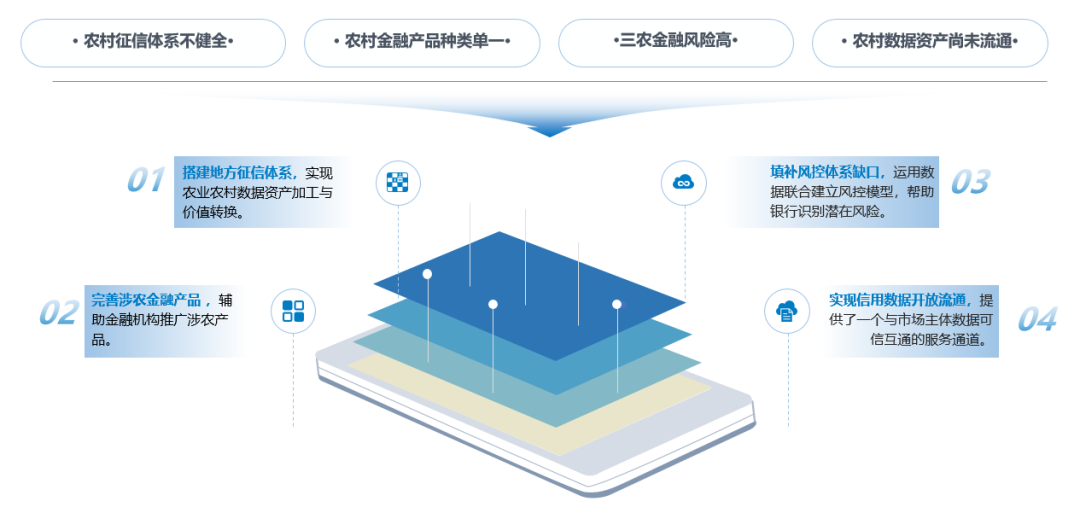 农村金融综合服务平台通过“政银企”联合共建,由政府相关单位主导,与金融机构合作,整合当地三农数据资源,进行数据资产化、推广数据服务、打造金融产品,提供一整套集金融贷款产品的展示及申请、数据服务的调用等功能于一身的综合服务平台。