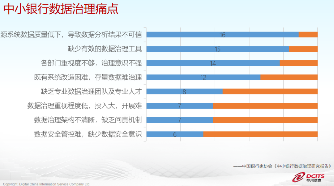 一方面, 结合业务现状对行内数据治理工作进行科学合理的中长期目标规划,构建科学合理的数据管理体系和数据管理架构,开展全行层面的数据治理文化宣导。