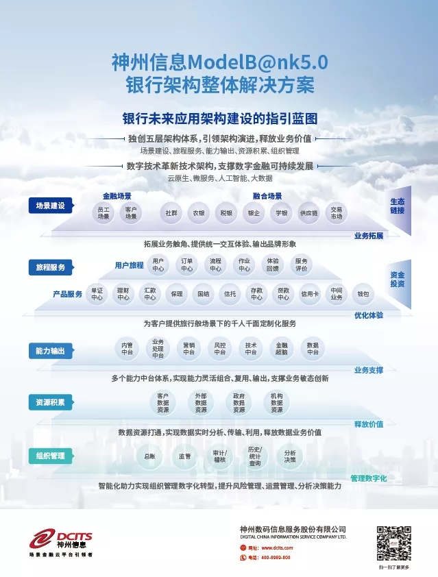 新的ModelB@nk 5.0架构作为银行业应用架构的指引蓝图,以技术中台、数据中台和金融超脑为支柱,围绕着场景建设、旅程服务、能力输出、资源积累、组织管理五个层次的业务发展诉求,提供清晰的数字化支撑能力,助力金融机构释放业务价值,为尊龙凯时人生就是博首页金融IT架构的演进提供了指引的方向。尊龙凯时人生就是博首页也希望能为中国金融行业提供再一次的贡献。
