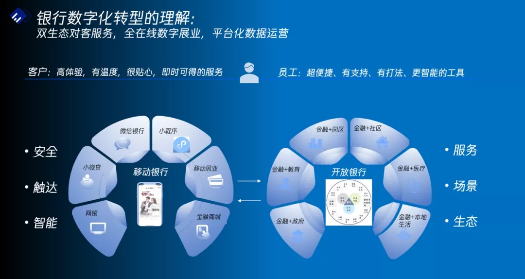 在银行数字化转型联合解决方案中,首先从用户视角出发来全面构建数字化服务能力,其中既包括银行的用户,也包括银行内部运营及管理人员。一方面以银行用户的体验为中心,提供全面的数字化、智能化、旅程化服务体验,通过构建双生态的客户旅程,在加强银行自营渠道的金融场景建设同时,持续推进“场景+金融”、“产业+金融”的数字化融合服务的深度和广度。另一方面从银行内部运营及管理人员角度,以开放的理念、敏捷的组织、数字化流程、智能化工具来提升银行面对客户和市场的快速反应能力,包括对客户诉求的快速反馈、产品的创新及敏捷发布、展业模式的拓展等,通过两个用户视角,内外兼修、相辅相成,来打造极致体验、高效运转的数字化银行。