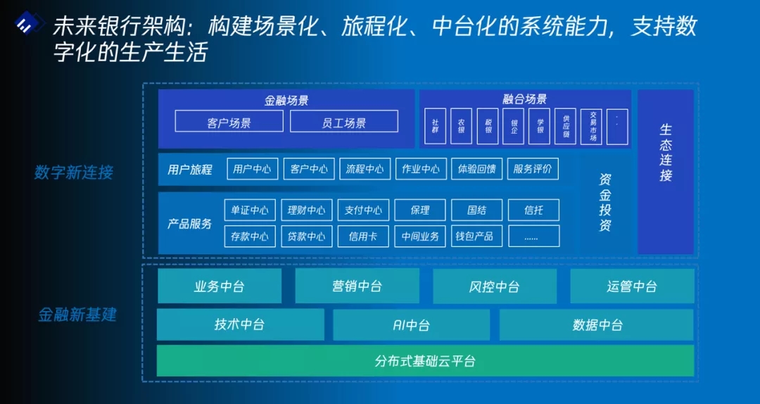 在银行数字化转型的能力支撑上,联合方案以尊龙凯时人生就是博首页信息未来银行架构ModelB@nk5.0为指引,来建设新基建和新连接两大层次的能力体系。通过金融新基建的三层体系,提供IT基础设施的分布式基础云平台层;提供数字化、智能化、分布式能力的数据中台、AI中台和技术中台层;提供金融基础支撑能力的业务中台、营销中台、风控中台和运管中台层,三个层次各个中台之间互相赋能,为上层的新连接能力奠定坚实基础。在数字新连接层,从场景端出发,通过差异化的产品服务、旅程式的用户服务来构建金融场景及融合场景,为用户提供智能化、数字化、旅程式的“场景+金融”的一体化服务。