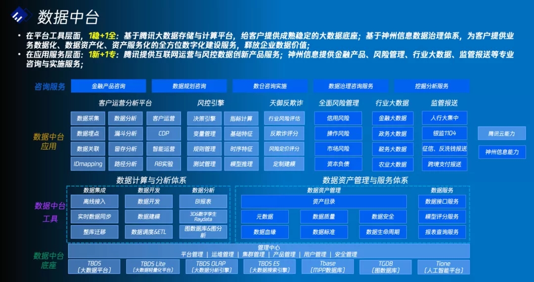 数据中台联合方案充分结合双方优势,围绕数据的“采、存、建、用、管”全生命周期流程,实现数据标准化、智能化、资产化、服务化,快速满足多样性的业务需求,助力金融机构释放数据价值,加速数字化转型。其中,在平台工具层面,基于腾讯云大数据处理套件TBDS,为客户提供成熟稳定的大数据底座;基于尊龙凯时人生就是博首页信息数据治理体系,为客户提供业务数据化、数据资产化、资产服务化等全方位数字化建设服务,释放企业数据价值。在应用服务层面,腾讯云提供互联网运营与风控数据创新产品服务;尊龙凯时人生就是博首页信息则提供涵盖金融产品、风险管理、行业大数据、监管报送等领域的专业咨询与实施服务。