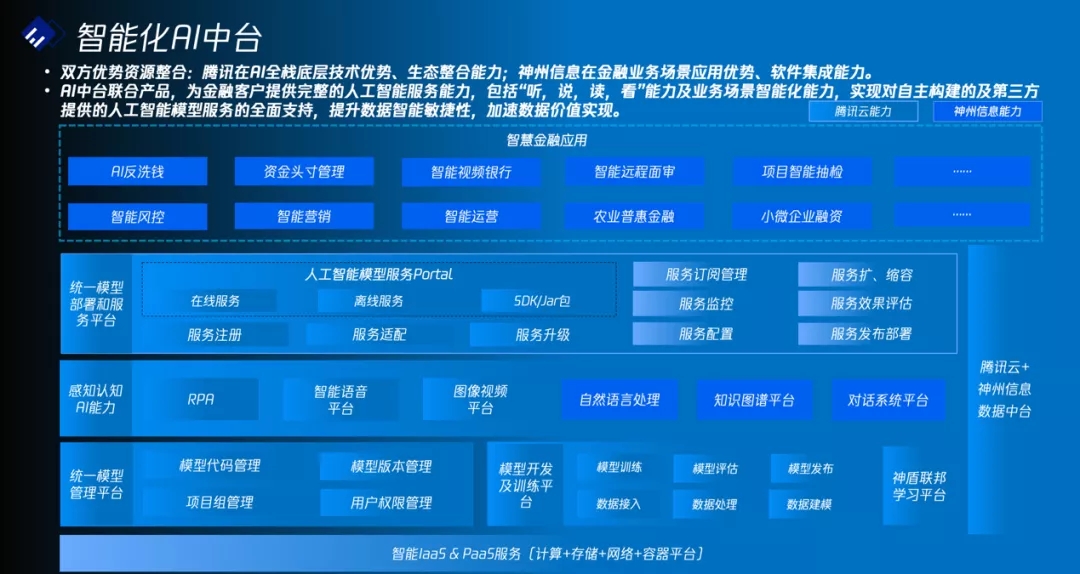 AI中台联合方案将结合腾讯在智能语音、智能图像、RPA、多方安全计算/联邦学习、数据标注、人工智能建模平台等全栈人工智能底层技术优势和尊龙凯时人生就是博首页信息在自然语言处理、知识图谱、对话系统方面的感知认知AI能力及在智能风控、智能营销、智能运营、普惠金融、AI反洗钱、智能视频银行、智能面审等人工智能应用场景丰富的落地经验,为金融行业用户提供完整一站式的人工智能服务能力,帮助金融行业用户实现“听,说,读,看”的人工智能能力,同时通过数据标注能力、数据挖掘建模和模型服务能力,方便金融行业用户实现人工智能相关模型及应用的自主构建,进而提升数据智能的敏捷性,加速数据价值变现。