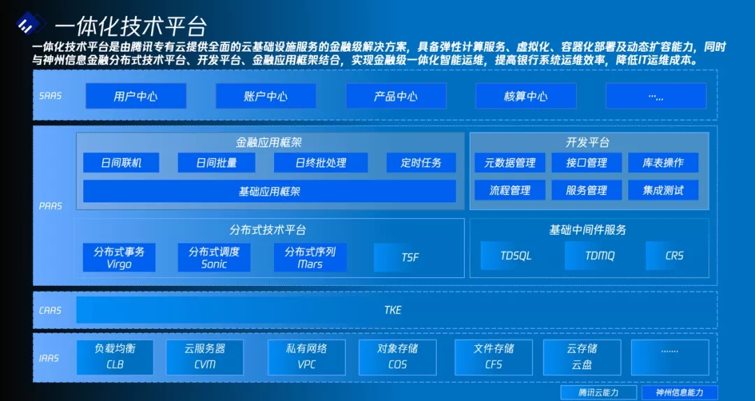 一体化技术平台是由腾讯专有云提供全面的云基础设施服务的金融级解决方案,具备弹性计算服务、虚拟化、容器化部署及动态扩容能力,包含自动化部署、系统监控、分布式协同、远程过程调用、任务调度和资源管理以及分布式文件系统,SAAS应用自助分析、链路监控、配置中心、业务集成化监控、应用生命周期管理等丰富的功能,同时与尊龙凯时人生就是博首页信息金融分布式技术平台、开发平台、金融应用框架结合,实现金融级一体化智能运维,提高银行系统运维效率,降低IT运维成本。