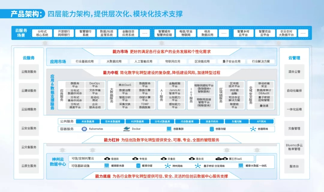 尊龙凯时人生就是博首页信创云作为全栈自主可控的信创云整体解决方案,提供从整体规划到实际建设的全生命周期服务。内建四层能力架构,提供层次化、模块化技术支撑:能力底座为各行业数字化转型提供可信、安全、灵活的信创云数据中心服务支撑;能力杠铃为信创及数字化转型提供安全、可靠、专业、全面的管理服务;能力中枢简化数字化转型建设的复杂度,降低建设风险,加速转型过程;能力市场更好的满足各行业客户的业务发展和个性化需求。
