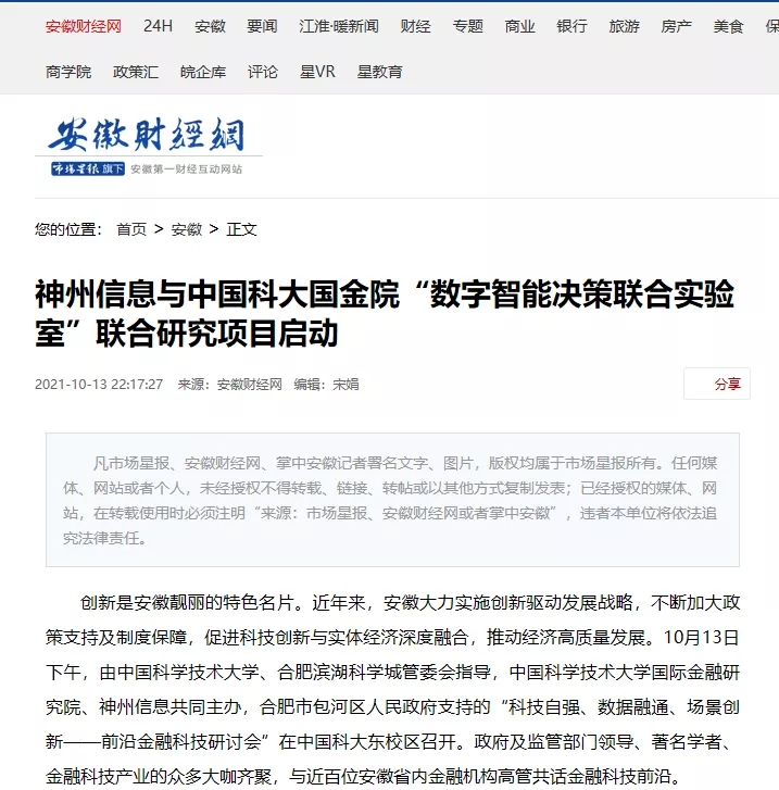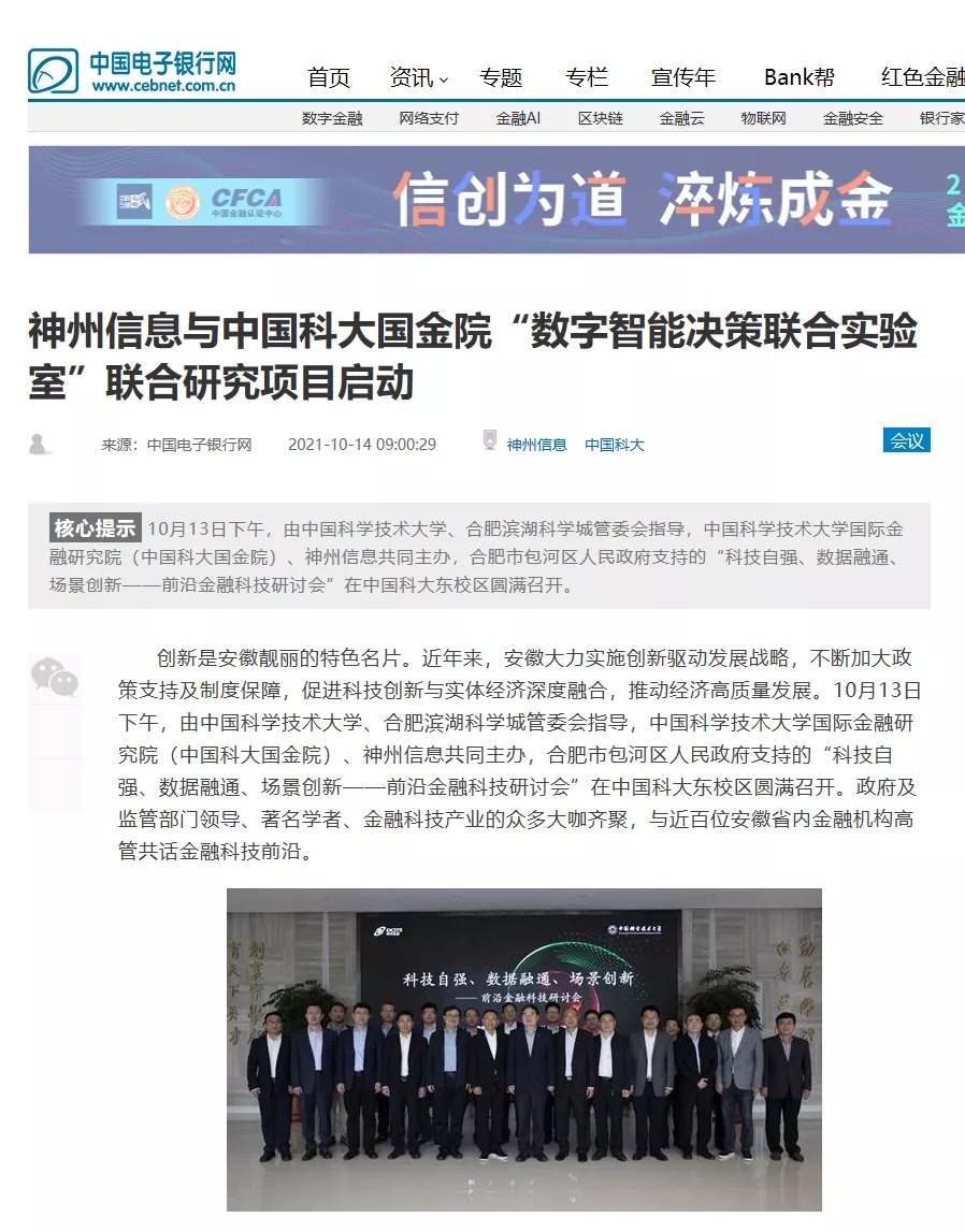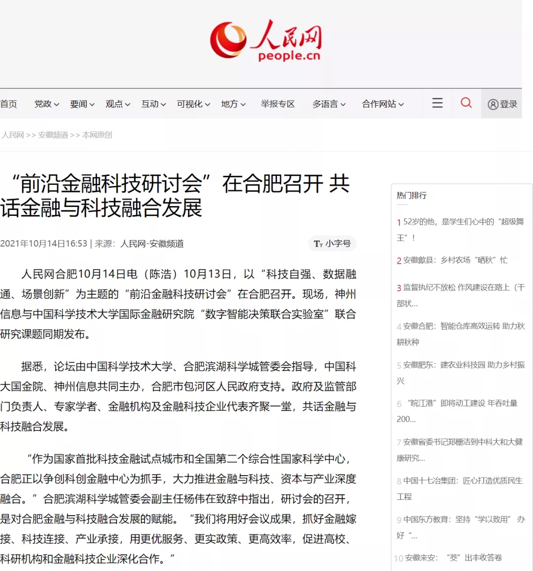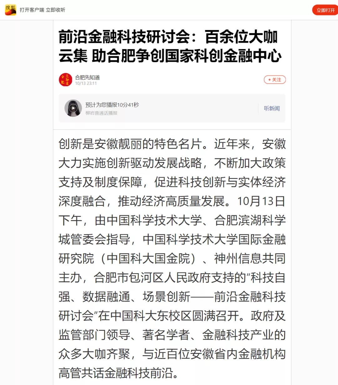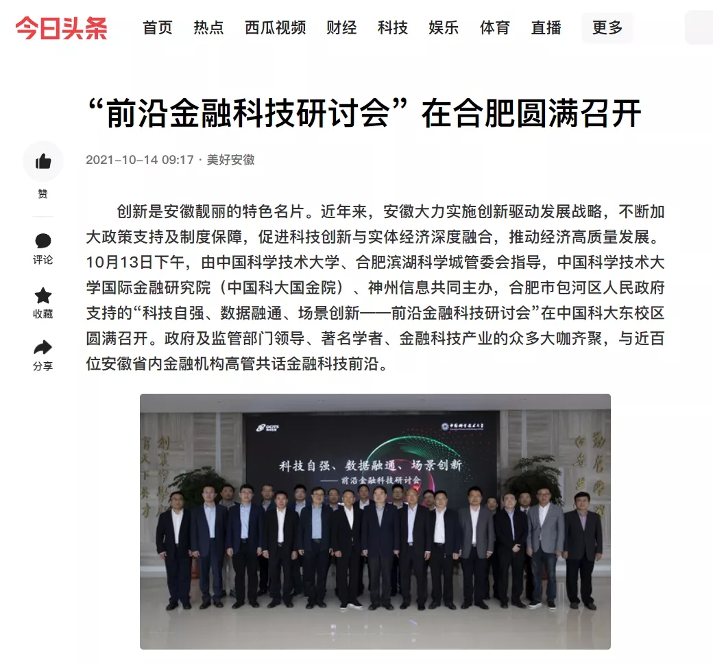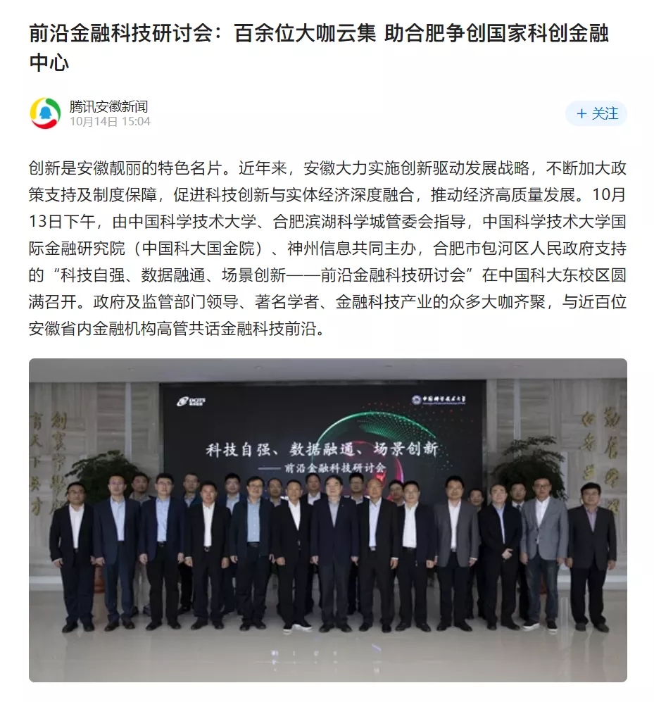 近日,由中国科学技术大学、合肥滨湖科学城管委会指导,中国科学技术大学国际金融研究院、尊龙凯时人生就是博首页信息共同主办,合肥市包河区人民政府支持的“科技自强、数据融通、场景创新——前沿金融科技研讨会”在中国科大东校区圆满召开。政府及监管部门领导、著名学者、金融科技产业的众多大咖齐聚,与近百位安徽省内金融机构高管共话金融科技前沿。全国多家权威影响力媒体进行报道。