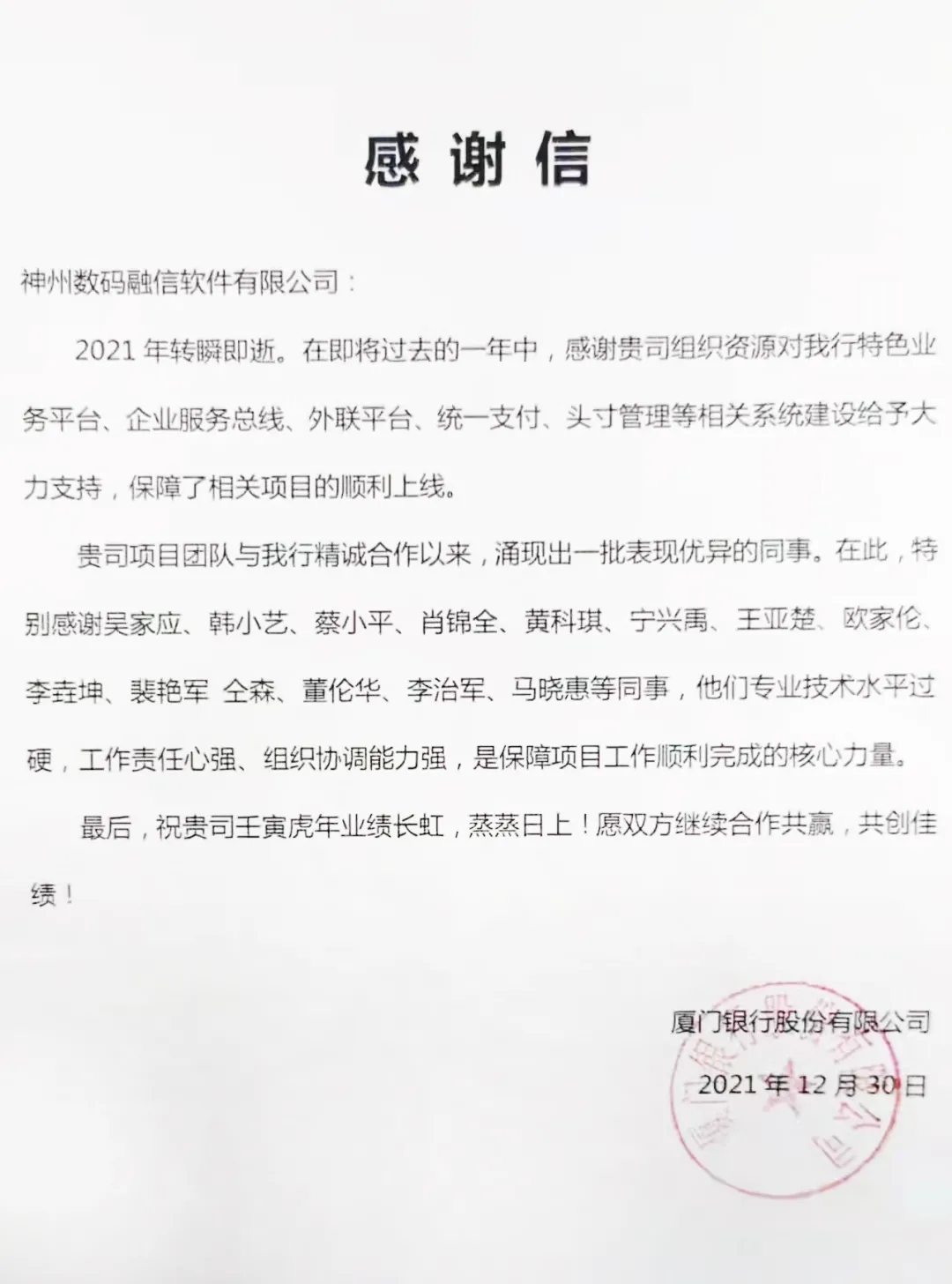 2021年转瞬即逝。在即将过去的一年中,感谢贵司组织资源对我行特色业务平台、企业服务总线、外联平台、统一支付、头寸管理等相关系统建设给予大力支持,保障了相关项目的顺利上线。
