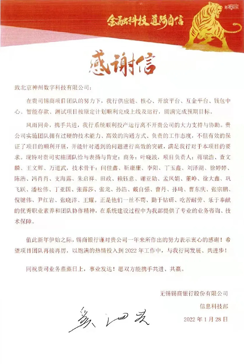 作为我行新一代分布式核心系统建设重要合作伙伴,贵司长期以来与我行肝胆相照、风雨同舟,以勇于创新的强烈意识,知难而进的开拓精神,解决问题的执着追求,在项目建设各阶段给予我行极大支持,协助我行顺利完成分布式技术平台、分布式运维平台以及国际汇款业务功能投产上线,为2022年4月新一代分布式核心系统全面投产奠定了坚实基础。