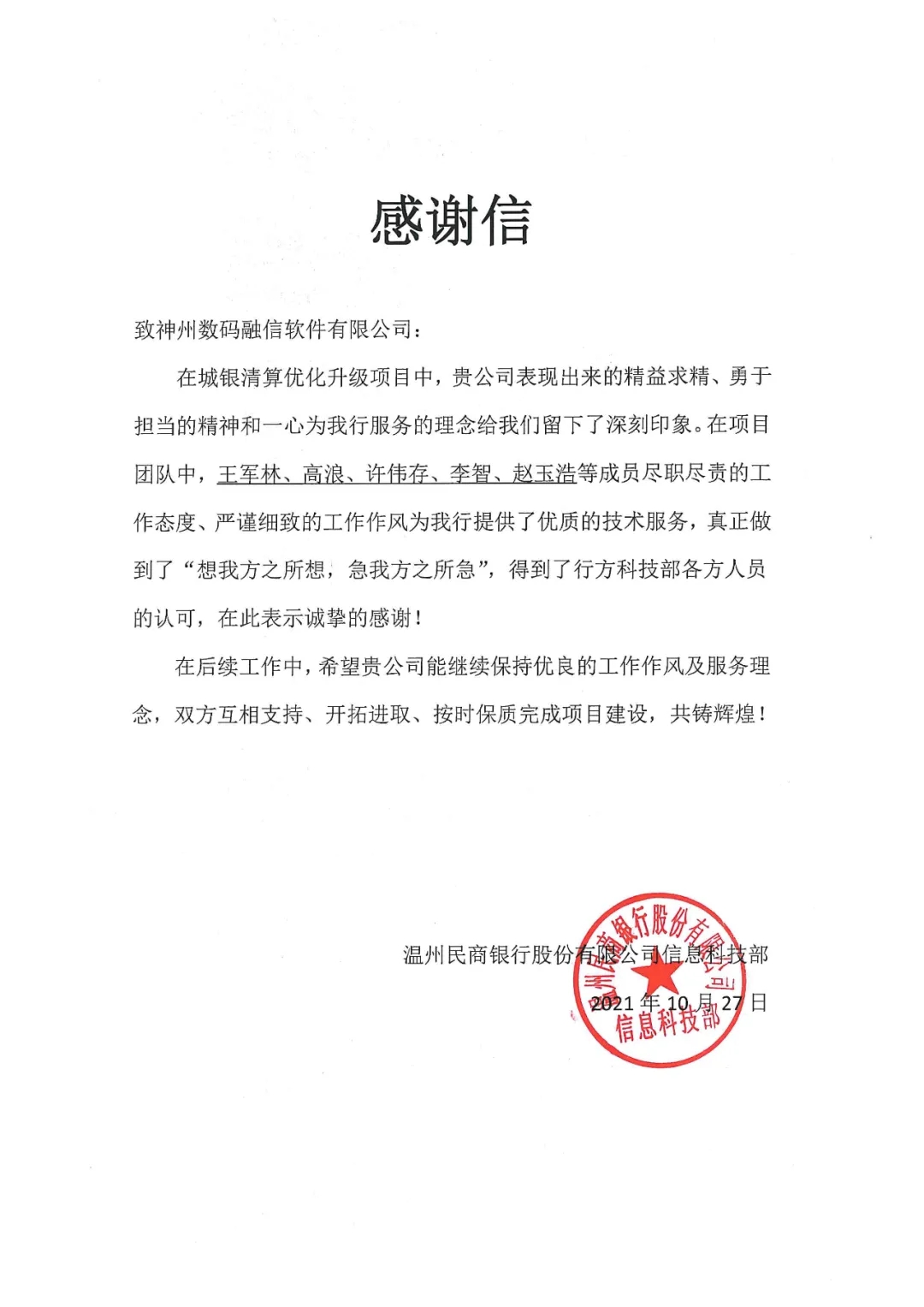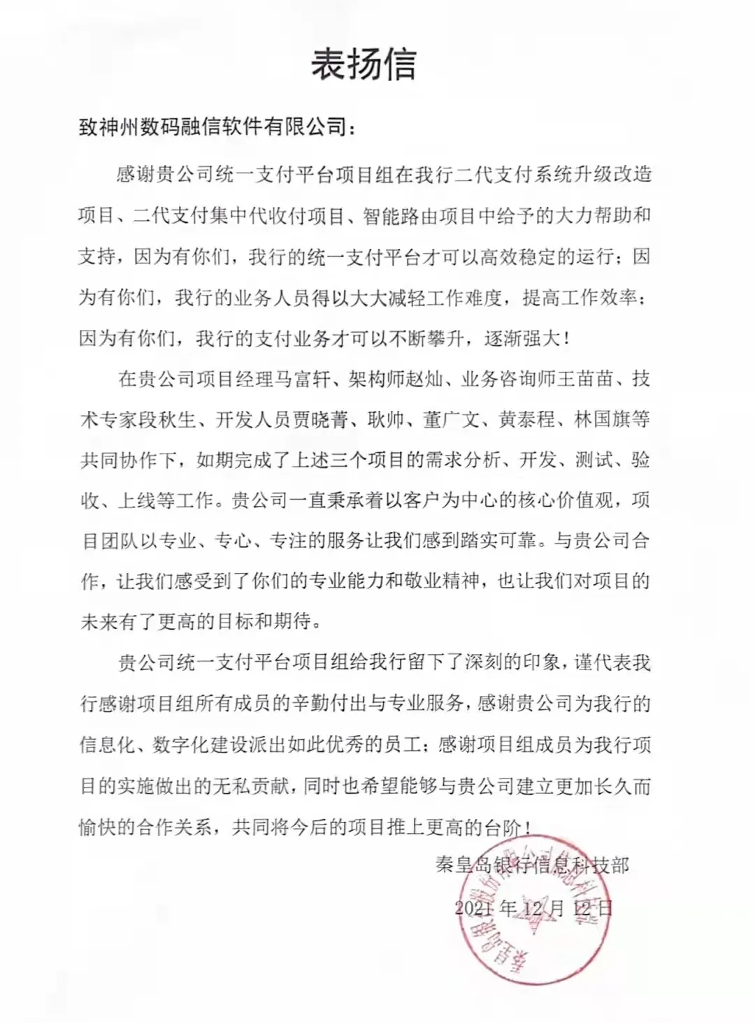 感谢贵公司统一支付平台项目组在我行二代支付系统升级改造项目、二代支付集中代收付项目、智能路由项目中给予的大力帮助和支持,因为有你们,我行的统一支付平台才可以高效稳定的运行;因为有你们,我行的业务人员得以大大减轻工作难度,提高工作效率:因为有你们,我行的支付业务才可以不断攀升,逐渐强大!