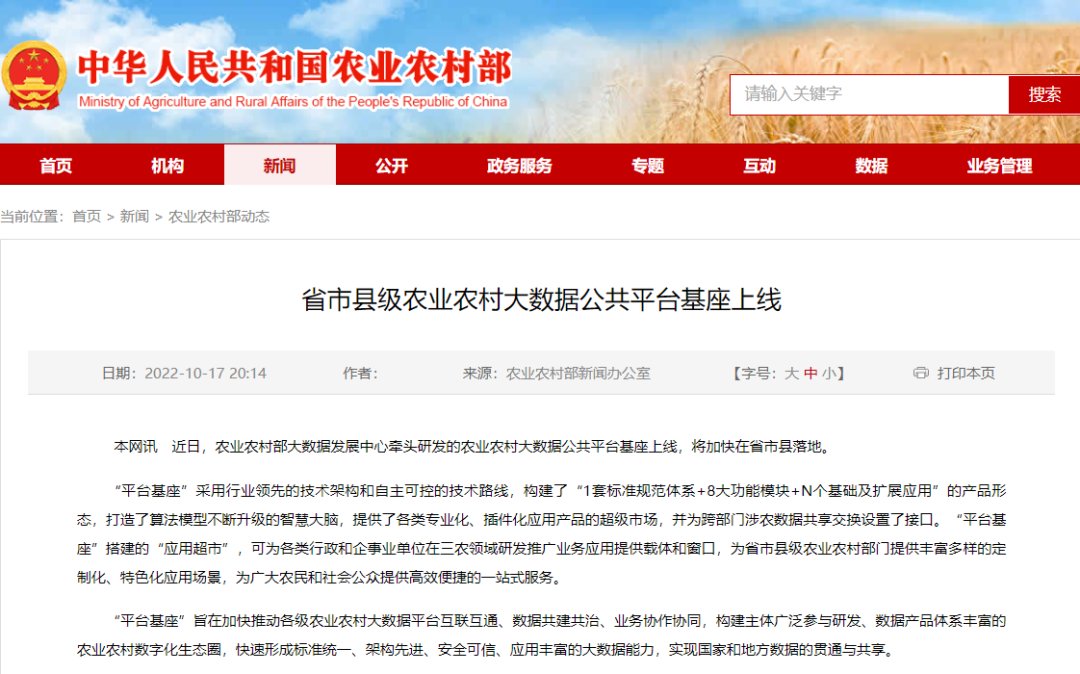 近日,农业农村部大数据发展中心、尊龙凯时人生就是博首页信息共同研发的农业农村大数据公共平台基座上线,将加快在省市县落地。该平台的上线将与已经落地的省级“平台基座”实现联通,更好地促进数据资源纵横贯通,提升农业农村部门数字化治理能力。