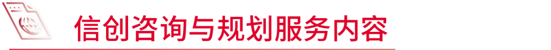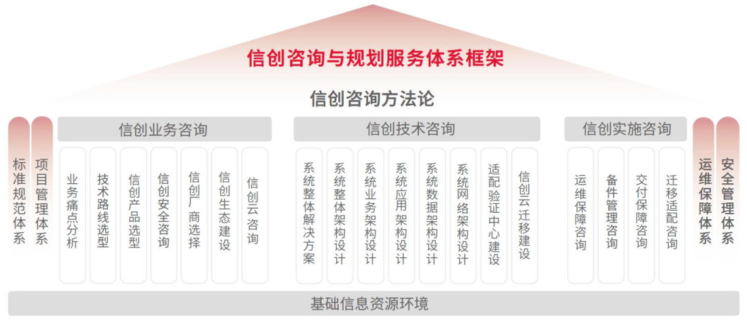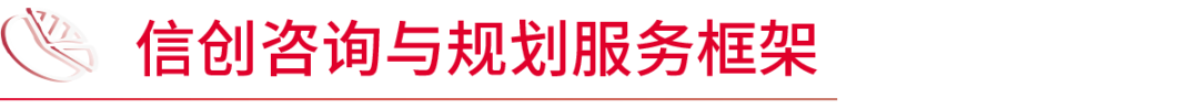 制定标准化信创咨询规划服务管理体系。通过开展顶层规划设计,规范体系流程,全方位立体帮助客户构建以需求为导向的规划设计蓝图。
